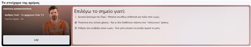 Ψάχνεις ακόμα το καλύτερο σημείο της ημέρας; Τώρα η Betsson κάνει τα πράγματα πιο απλά. Κάθε μέρα, ο Παντελής Διαμαντόπουλος διαλέγει για σένα το «Στοίχημα της ημέρας» για να έχεις πάντα μια ιδέα… από έμπειρο χέρι.